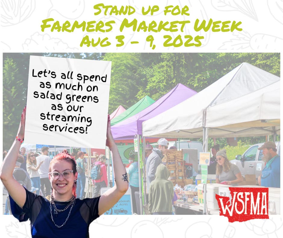 If it’s snuck up on you this year and you don’t have a lot prepared,we suggest checking in right now with your state farmers market association. Many of them have local resources that will make it easy to post and to amplify messages that your neighboring markets, farmers and producers are getting out there. We love the campaign that the Washington State Farmers Market Association has created with the theme Stand Up for Farmers Markets and the graphics they’ve provided to be shared by their farmers markets statewide.